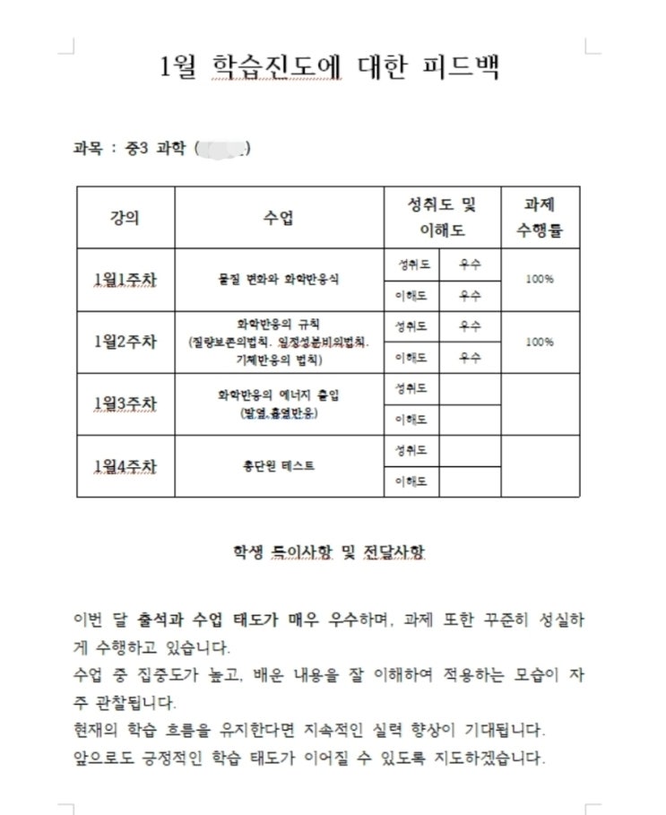 매월 말에 학생과의 수업및 성취도 과제 학습태도등 전반적인 모든부분을 학부모님께 안내 발송드리며 피드백 할수있도록 하였습니다. 모든부분은 계획에 맞추어서 진행되며 단원마무리 평가와 어려운 소단원은 주기적으로 학습테스트 들어감으로써 자신감 더욱 가질수있도록 학습진행하겠습니다. <img src="https://blogthumb.pstatic.net/MjAyNjAxMDZfMjUx/MDAxNzY3Njg4MTA1MDY3.HoJbzwGRG1Cub6BUxjNdkxXL17OKNuZ8E9GFZCFlE7Ag.JnPwHDdLx_dFwW-bjpJwVL3DnZbrgglLWLbkxyUWJwgg.JPEG/900%A3%DFScreenshot%A3%DF20260106%A3%DF172333%A3%DFKakaoTalk.jpg?type=s3" />