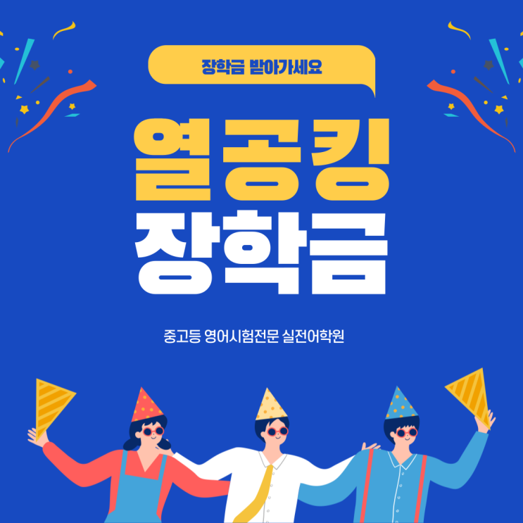 실전어학원에서 열공킹 장학금 관련 안내말씀드립니다. 실전어학원 학생들 중 열공킹 장학금 대상자 선정을 확인하기위해 영어성적 90점 이상 받은 학생 이전성적보다 9점 이상 오른 학생 영어100점 학생은 학생이름이 포함된 영어성적(90점~100점), 이전 영어성적+이번 영어성적(9점 이상 오른 학생)을 사진 찍으시거나 혹은 캡쳐하셔서 학원카톡으로 보내주시면 됩니다. 저희 실전선생님들이 학생들의 동기부여를 위해 준비하였으니 장학금은 학생에게 직접 수여되는 점 미리 양해를 구합니다. 언제나 저희 선생님들은 학생들의 영어성적 향상을 위해 최선을 다하겠습니다. 감사합니다. 실전 학생들과 선생님들의 더많은 이야기는 아래 인스타....... <img src="https://blogthumb.pstatic.net/MjAyNTEyMTlfMjY3/MDAxNzY2MTQ4MjE5MDY4.LpHn4Ah4kaTL9ZbKc9TyGWhPJvds-zTlYyJt8NlbgVYg.oiH4QTYjvugGxbyA6XkQ467lQalLwwG41g3xFFTfDsMg.PNG/%C1%A6%B8%F1%C0%BB-%C0%D4%B7%C2%C7%D8%C1%D6%BC%BC%BF%E4_-001_%2861%29.png?type=s3" />