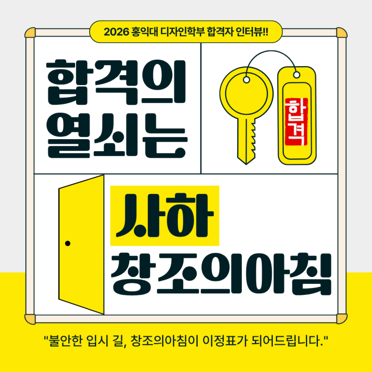 2026 합격자 인터뷰 공개 홍익대학교 디자인학부 합격 2026학년도 홍익대학교 디자인학부 최초 합격 ✨ 남*여고 3학년 | 이** 학생 사하 창조의아침 기초소양반에서 준비한 홍익대학교 디자인학부 준비 서울·수도권 대학을 목표로 한다면 기초소양 수업은 선택이 아닌 필수입니다. 사하 창조의아침은 ✔ 서울 전담 강사 ✔ 사하 단독 기초소양반 운영 ✔ 서울·수도권 미대 평가 기준에 맞춘 전용 커리큘럼으로 수업합니다. ✔️ 주제 해석력 ✔️ 사고의 흐름이 보이는 작업 구성 ✔️ 면접에서 흔들리지 않는 설명력 결과는 홍익대 디자인학부 합격으로 증명되었습니다. 입시를 준비하는 시간은 길고, 때로는 불안합니다. 특히 미대 입시....... <img src="https://blogthumb.pstatic.net/MjAyNjAxMjBfMjUy/MDAxNzY4OTAyOTgzMzk4.0M0MXEwCt5uvesJnnBrbkPT1z4iVRfj63A5b1mvwtvwg.qONQSh2d2BAy6gL28AEQLvlmQUDAIdDOjEwIW4nEyogg.PNG/%C1%A6%B8%F1%C0%BB_%C0%D4%B7%C2%C7%D8%C1%D6%BC%BC%BF%E4._%287%29.png?type=s3" />