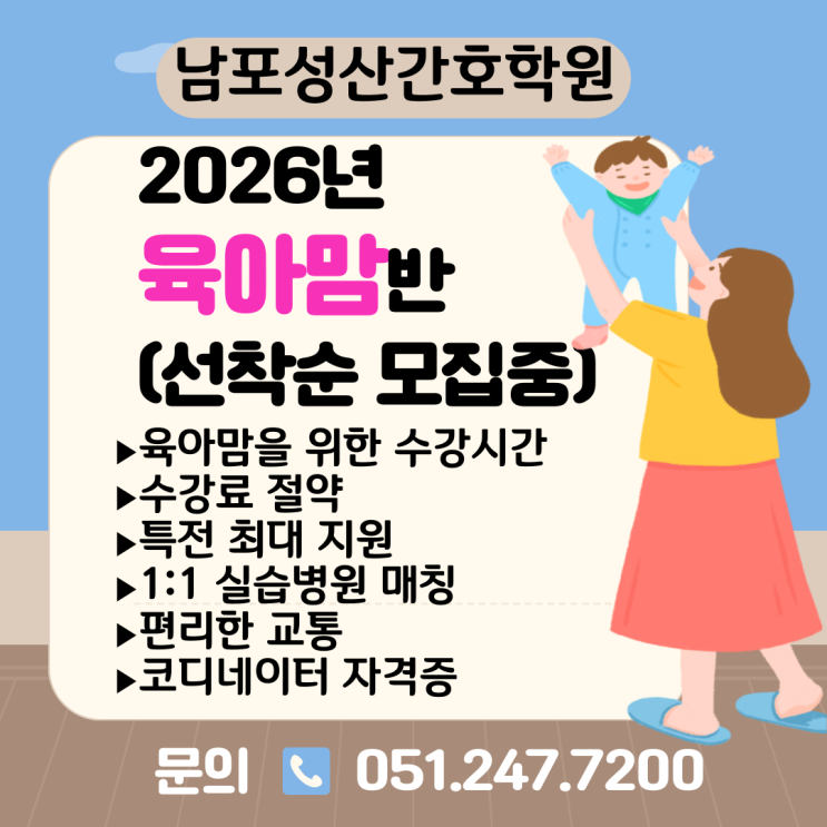 국가기술자격 2026년 " 간호조무사 자격증 취득과정 " 육아하면서 자격증 공부까지?! 육아맘을 위한 반 개설예정! 육아를 하면서 자격증 취득하기 시간상 부담스러우셨죠? 걱정마세요! 육아맘을 위해 수강시간을 배려하여 육아맘반이 개설될 예정입니다*^^* 당연히 육아맘이 아니셔도 수강가능합니다!! 자격증 취득+취업+소득발생!! 위 3가지를 동시에~?! 완전 가능! 간호조무사 자격증에 관심이 있으시면 언제든 남포성산간호학원 051-247-7200으로 전화주세요. 자세하게 1:1 상담 해드립니다. ★ 남포성산간호학원에 자주 하는 문의사항★ Q. 본인부담금(국비)은 얼마예요 ? (답) 0원~ 748,600원 Q. 교육비 외에 드는 비용이 있나요....... <img src="https://blogthumb.pstatic.net/MjAyNjAxMjdfNSAg/MDAxNzY5NTAwNjE5MjA5.vZtmMPKf3dtibwOBkkDLTchk-c8h2RVRBLemyxtn_qQg.38_zzsmtByLDWsLxEtaOHEXIyH5TWXQxyPPuD8YiyEog.PNG/%C1%A6%B8%F1%C0%BB-%C0%D4%B7%C2%C7%D8%C1%D6%BC%BC%BF%E4_-001_%281%29.png?type=s3" />
