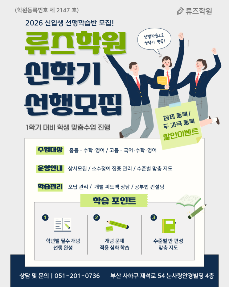 안녕하세요, 류즈학원입니다 :) 2026년 새학기를 맞아 저희 류즈학원에서 중고등 대상 신입생을 모집합니다~! 특히 1학년 학생들의 경우, 중학교, 고등학교 공부를 처음 마주했기에 어떻게 시작해야할지 막막했을 텐데요. 무엇부터 준비해야할지 모두가 처음인 이 시기, 지금 이 시기부터 탄탄하게 준비하여 나아가는 것이 아주 중요합니다. 류즈학원에서 함께 기초부터 탄탄하게 쌓아봅시다 - 중학생 대상 과목 : 영어 · 수학 - 고등학생 대상 과목 : 국어 · 영어 · 수학 으로 준비되어 있습니다~! - 형제·남매·자매 동시 등록 시 - 두 과목 동시 등록 시 할인 혜택도 마련되어 있답니다 :) 저희 류즈학원은 학년별 수준별 소수정예로 반을....... <img src="https://blogthumb.pstatic.net/MjAyNjAzMDRfMTcw/MDAxNzcyNjE0MjI0MDI3.TPw4VL7N25q3AkDgw3XyxfziGYq-LPlt2qMDJhH8nOog.LhSteLCMd9VGttkkU2TiupfYkxTmfmYQOp0Sh8L9hYAg.PNG/%BD%C5%C7%D0%B1%E2_%BC%B1%C7%E0%B8%F0%C1%FD.png?type=s3" />