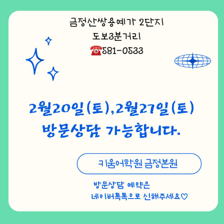 안녕하세요 키움어학원 금정본원입니다 새학기를 맞아 2월 토요일 방문상담 가능일을 공지해드립니다. 네이버예약으로 편리하게 상담예약 하세요 <img src="https://blogthumb.pstatic.net/MjAyNjAyMTFfNyAg/MDAxNzcwNzQyOTE2NTQ1.yfBb2aqtNTzR960AiOF-OoQvpocZBkEmaw3UwZoANDQg.4tS2I1YJBSP_uQYXghA6cY6rKEnk5tXXPOQhXvOiV9Ug.PNG/900%A3%DFHiring_Announcement_Instagram_Post%A3%DF20260211%A3%DF015856%A3%DF0000.png?type=s3" />