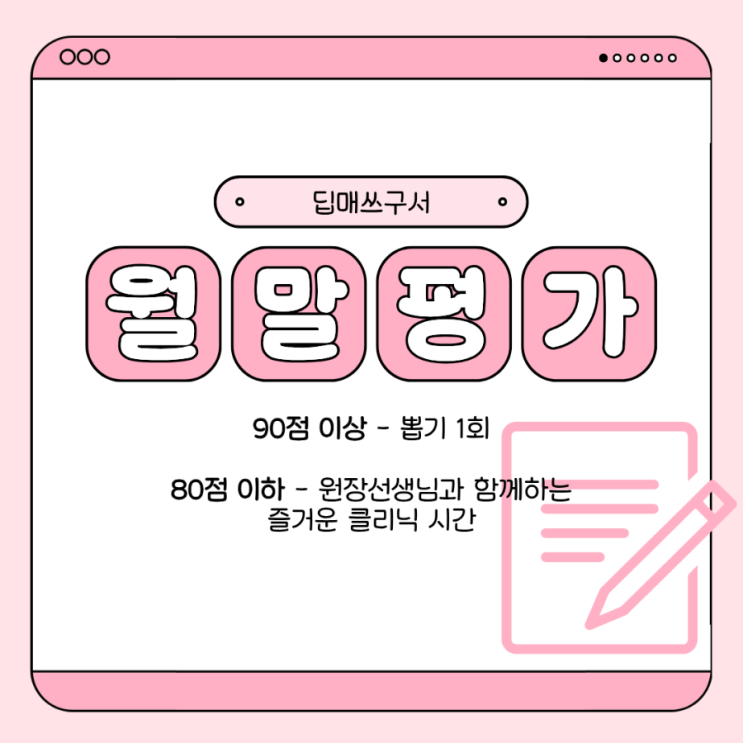 초등: 월말평가 중1: 격주평가 중2와 중3: 주간평가 평가지는 모든 원생 동일합니다. 총 25문제 초등은 40분, 중등은 45분으로 시험시간은 주어집니다. 초등은 단원별/ 중등은 소단원별로 평가해서 차곡차곡 단단하게 나아갑니다. 경시대회가 중상위권의 점검이라면, 월말평가및 주간평가는 중하위권 아이들의 점검입니다. 80점 미만 친구들은 주말 개인별 오답클리닉을 통해 제때 누락되어 있는 학습은 점검하고 지나갈수 있게 지도중입니다 상위권부터 하위권까지 놓치는 아이없도록 최선을 다해 지도중입니다 #개인별맞춤교재 #구서동수학학원 #딥매쓰 #초중등수학 <img src="https://blogthumb.pstatic.net/MjAyNjAzMThfMjg5/MDAxNzczODA3MDIxNTg3.1WRdSC9aI42lt0AymRzW9VEmpV7P3VoBnKKeP-DdaGQg.e2OU12kUuEm2avjixAfkR-BgCGk6IID60OAIVr0zZpEg.PNG/900%A3%DF1769686764595.png?type=s3" />