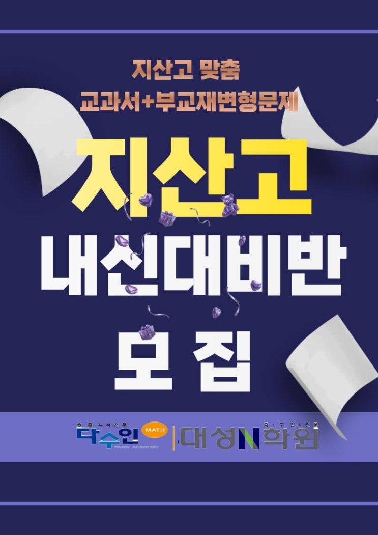 지산고 내신대비반 모집 안내 “지산고 내신, 준비 방식이 등급을 만듭니다.” 지산고에 진학하면 많은 학부모님들이 공통적으로 느끼는 부분이 있습니다. “학교 수업만으로 내신을 안정적으로 관리하기가 생각보다 어렵다”는 점입니다. 지산고 시험은 단순히 문제를 많이 풀었다고 해서 좋은 결과가 나오는 시험이 아닙니다. 교과서 내용과 학교 수업에서 강조된 개념, 그리고 프린트 자료, 부교재 까지 학교 수업 흐름을 정확히 이해하고 준비한 학생들이 높은 등급을 받는 구조입니다. ■ 지산고 시험의 특징 지산고 시험은 다음과 같은 특징이 있습니다. 개념 이해 중심 문제 출제 교과서 + 부교재 변형문제 응용 및 서술형 문제 비중 증가....... <img src="https://blogthumb.pstatic.net/MjAyNjAzMTFfMjgy/MDAxNzczMjMxNjkyNjcz.YOWdvYNFHrGaAqXqj5pcL8jiBheIQtnO-NpEtnFujoYg.yVUNjqtnqrTwJt0t9hHcv6lkaUE8jXMKwNTlUGtU2esg.JPEG/%C1%A6%B8%F1%C0%BB_%C0%D4%B7%C2%C7%D8%C1%D6%BC%BC%BF%E4..jpg?type=s3" />