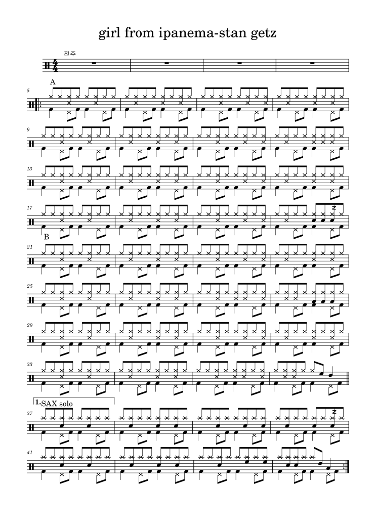 인류 역사상(앞으로 다가올 미래까지 포함하여) 가장 유명한 보싸노바 곡입니다. 약간의 편곡이 들어갔습니다. *연습하면 큰 어려움 없이 치실수 있도록 취미 드러머분께 맞춰 쉽게 편곡된 악보입니다. 원곡과 똑같은 악보를 원하시는 분은 악보사이트를 참조하세요. #쉬운드럼 #쉬운드럼악보 #stan_getz_드럼 #girl_from_ipanema #girl_from_ipanema_드럼 <img src="https://blogthumb.pstatic.net/MjAyNjAzMDlfMjU3/MDAxNzczMDE4NjEwNzQ3.exECV5259BbaO3PkGg_QKHZO1yFo2nLxs1DuMD3-qUYg.7hEkTvYScqaEoOJ4iIscyWxwQ9pYj-3b0bwLUQLmNpIg.PNG/girl_from_ipanema-stan_getz-1.png?type=s3" />