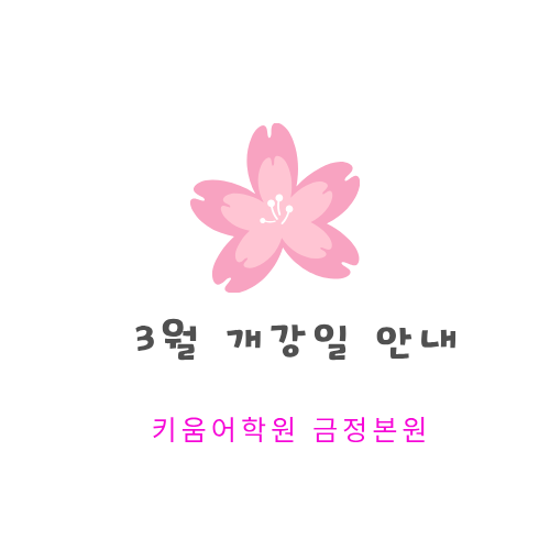 안녕하세요 키움어학원 금정본원입니다. 벌써 봄기운이 물씬 느껴지는 새학기를 맞이합니다 ♡♡♡ 초등영어 주5일반 3월3일(화) 개강 초등영어 주4일반 3월4일(수) 개강 초등영어 주3일반 (예비중등반) 3월6일(금) 개강 중등영어 주3일반 3월4일(수) 개강 유아영어 개강일 안내 3월6일 목요일 4시40분 시작반 체계적인 커리큘럼 자세한 피드백 흥미와 실력을 동시에! 금정구 차량운행중 <img src="https://blogthumb.pstatic.net/MjAyNjAyMjhfMjc2/MDAxNzcyMjMxMzY5Njc3.65TGySanuKmTStqQFQK0Wuw5qvrrYw1ezzfkHjPf8F8g.l6d814Q3K5IeyE2kk30ZGgCyeml_b7w3D6lqWImvGuUg.PNG/Pink_Sakura_Flowers_Logo%A3%DF20260228%A3%DF072638%A3%DF0000.png?type=s3" />