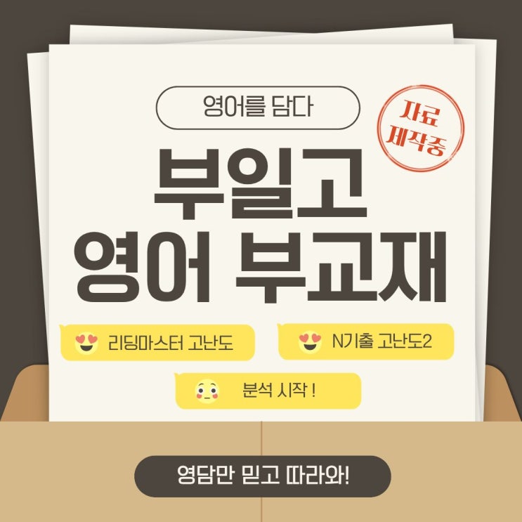 안녕하세요. 영어를담다 원장 전재석입니다. 새학기가 시작된 지 얼마 되지 않았는데 요즘은 정말 일복이 터진 느낌입니다. 각 학교들의 영어 부교재가 하나둘씩 확정되고 있는데, 올해 특징이 하나 있습니다. 거의 대부분이 27년 개정판 교재네요. 물론 부일고도 예외는 아니었습니다. 부일고는 올해 부교재로 리딩마스터 고난도 N기출 고난도2 이 두 권을 채택했습니다. 그런데 문제는… 두 교재 모두 거의 ‘희귀 자료급’이라는 점입니다. 시중에 자료가 거의 없다 보니 요즘은 틈나는 대로 자료를 직접 만들고 있습니다. 하루에 최소 1시간은 자료 제작 시간으로 쓰고 있습니다. (생각보다 시간이 꽤 걸리네요… ) 그래도 우리 영....... <img src="https://blogthumb.pstatic.net/MjAyNjAzMTZfMTA5/MDAxNzczNjQyMDI5MzYx.iDdlHnz8rHeU-UbymE5OaRnYHytXXfDfSLXNTYTyBTwg.Jj0CK1Ls5pBLE3KUYcFzy-jtuhn2JWo26Pzp__tEmtEg.JPEG/%C1%A6%B8%F1%C0%BB_%C0%D4%B7%C2%C7%D8%C1%D6%BC%BC%BF%E4._%2839%29.jpg?type=s3" />
