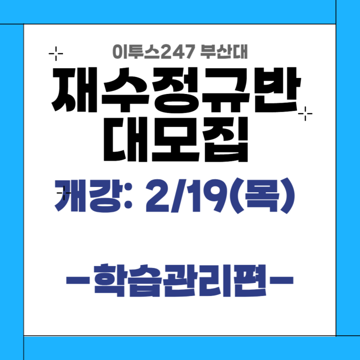 안녕하세요, 이투스 부산대점입니다. 2027학년도 재수정규반이 2/19(목)에 개강합니다!! 아쉬움이 남아 다시 한번 더 도전 하고 싶다면 고민은 시간 낭비일 뿐 이투스247 부산대점으로 오세요~~ 자신에게 맞는 공부습관이 생길 수밖에 없도록 지도하는 시스템 철저한 관리 시스템으로 성적이 오를 수 밖에 없는 꼼꼼한 관리 비법을 소개 해드릴께요 첫째, 주간계획표 작성 저마다 학습의 방향과 목표와 방법이 다른 법 일률적으로 모든 사람이 같은 시간표로 움직일 순 없죠~ 개개인이 스스로 구체적인 주간 계획은 작성하여 선생님과 구체적인 상담을 합니다. 내가 월요일 1교시엔 무슨공부를, 어느교재로, 어느 분량 만큼 할 것인지 구체적이며....... <img src="https://blogthumb.pstatic.net/MjAyNjAyMTJfMTc0/MDAxNzcwODgwNTQwMzM2.hmwY3Grdxfb2h_nrjAPf4zLMvxiAlLgBSpg0v1dYelAg.arNW8NRyogZkDZNiRJjNA1CeA3uRwaC0ukz-KBQ7vKsg.PNG/%C1%A4%B1%D4%B9%DD%B4%EB%B8%F0%C1%FD_-_%C7%D0%BD%C0%B0%FC%B8%AE%C6%ED-.png?type=s3" />