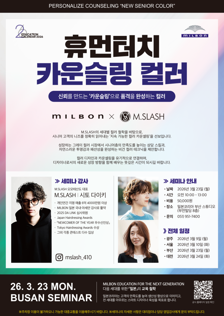 ✔️날짜: 2026.3.23(월) ✔️시간: 오전 10:00 ~ 13:00 ✔️장소: 밀본코리아 부산 스튜디오 (부산 부산진구 신천대로50번길 79, 8층) 시니어 고객의 니즈를 정확히 읽어내는 ‘지속 가능한 컬러 카운셀링' 성장하는 그레이 컬러 시장에서 시니어층의 만족도를 높이는 상담 스킬과, 자연스러운 투명감과 패션성을 완성하는 비건 컬러 테크닉을 제안합니다. ※ 교육 문의 및 신청은 구시코리아 담당 영업사원에게 부탁드립니다. <img src="https://blogthumb.pstatic.net/MjAyNjAyMTJfMTgy/MDAxNzcwODU3MDY4NjMy.WYbW_j9HO59hyG-GTeiXWEVroS5LH9nzPwgspcpfNi4g.777OV-Z-2EmDKE9F5_O8NQ8tupNsR_jbpecq5j881hIg.PNG/KakaoTalk_20260211_093243838.png?type=s3" />