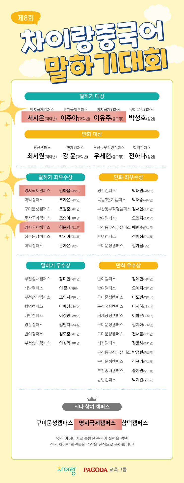 大家好~ 명지국제차이랑중국어입니다! 이번에 정말정말 좋은 소식을 가지고 왔는데요 명지국제차이랑이 전국대회에서 대상을 휩쓸었습니다! 초등 저학년 대상 서시은 초등 고학년 대상 이주아 중고등부 대상 이유주 초등 저학년 최우수상 김하음 중고등부 최우수상 허윤서 초등 저학년 금상 이수빈, 정담 초등 고학년 금상 이현상, 이현승, 최은율 전국 캠퍼스 중에서도 저희 명지국제캠퍼스 학생들이 1등과 2등을 모두 차지하는 놀라운 결과를 만들어냈습니다. 아이들이 긴 시간 동안 꾸준히 연습하며 노력해 준 덕분에 이렇게 값진 결과가 나왔답니다 발음, 표현력, 자신감까지 한 단계 성장한 모습이 정말 자랑스러울 수밖에 없죠 특히 이....... <img src="https://blogthumb.pstatic.net/MjAyNjAzMTJfMTky/MDAxNzczMjk4MjkwOTE3.FPdhR3p_kjQqzE98aOLhHz2l2JU1PF-2xHRQ4p655XIg.Btuq9kLOdYe3FpIhDtr3u9ps9hmGpXLlh2hVDyFWMtsg.PNG/KakaoTalk_20260312_154116622.png?type=s3" />