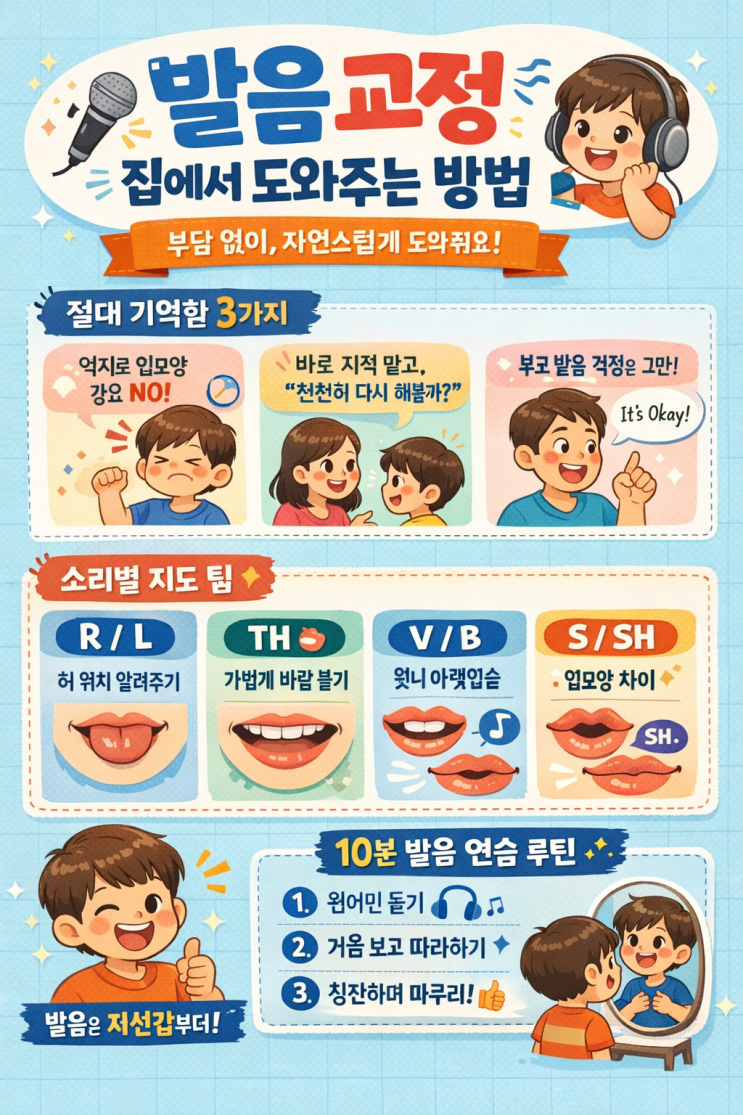 “집에서 도와주고 싶은데… 괜히 잘못 가르치면 더 나빠질까 봐요.” 많은 학부모님들이 하시는 걱정이에요. 발음 교정은 정확한 방향 + 가벼운 반복만 지켜도 충분히 좋아질 수 있습니다. 오늘은 집에서 무리하지 않고, 아이의 영어 발음을 부드럽게 잡아주는 방법을 정리해드릴게요. ⭐ 절대 먼저 기억해야 할 3가지 1) 아이 입모양을 억지로 따라 시키지 않기 발음 교정은 “모양 흉내”가 아니라 소리 위치를 느끼는 것이 더 중요해요. 억지로 입 벌리라고 하거나, 치아를 보여주라고 강하게 요구하면 오히려 자신감이 떨어집니다. 2) 틀린 발음을 바로 지적하지 않기 “틀렸어”, “아니야”보다는 “좋아! 다시 한번 천천히 해볼까?”....... <img src="https://blogthumb.pstatic.net/MjAyNTEyMjZfMjM1/MDAxNzY2NzMxMTEzNzgy.3H8QeE79VdEeeYtwXr8TMBdiItWz5HfARDlB2eXVYgwg.hl8aRJd4SXa1pSYzigUEB3fSEBSrAv6G690IGUqpO-0g.PNG/ChatGPT_Image_2025%3F%85%84_12%3F%9B%94_26%3F%9D%BC_%3F%98%A4%3F%9B%84_03_36_31.png?type=s3" />