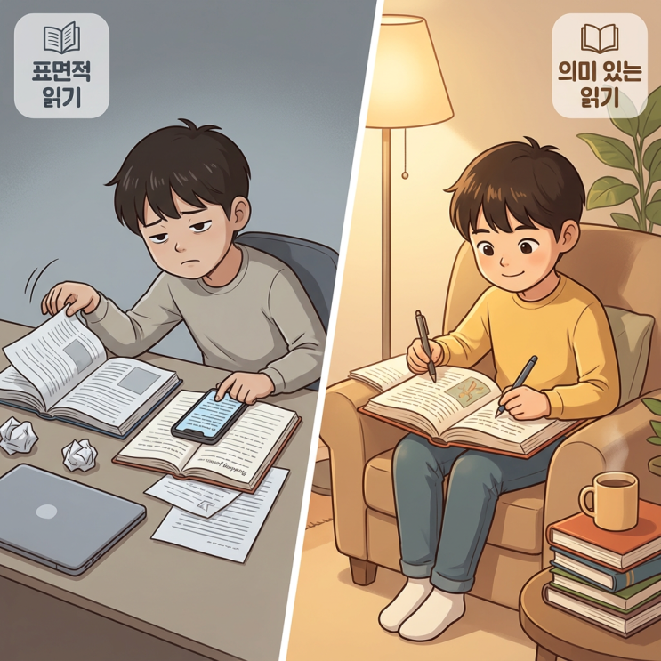 독서기록장의 함정 선생님, 저희 애는 책은 많이 읽는데 왜 독해력이 안 늘까요? 학원을 운영하며 가장 많이 듣는 질문 중 하나입니다. 독서기록장을 열심히 적어오는데 정작 책 내용을 물어보면 대답을 못하는 아이들. 문제는 '읽었다'와 '제대로 읽었다'의 차이에 있습니다. 지난 몇 년간 독서기록장을 운영하며 발견한 불편한 진실이 있습니다. 상당수의 아이들이 책을 진짜로 읽지 않고, '숙제로서의 독서기록장'을 채우기 위해 줄거리 요약본을 베끼거나 대충 훑어보고 적어옵니다. 이런 독서는 교육적 효과가 거의 없습니다. 오히려 독서를 '해치워야 할 숙제'로 인식하게 만들고, 책과의 진정한....... <img src="https://blogthumb.pstatic.net/MjAyNjAxMDZfMjcy/MDAxNzY3NjU3NDg2MTA3.d0XZ_dV-wPz-ov4iFbcgCE2o95nNv1yLWaTV_lS3iH0g.EHfx14fFVmWlf8NAxXZoxejb3tlHkRjQRt4UKlof6KYg.PNG/%3F%8F%85%3F%84%9C%3F%8A%B5%EA%B4%3F.png?type=s3" />