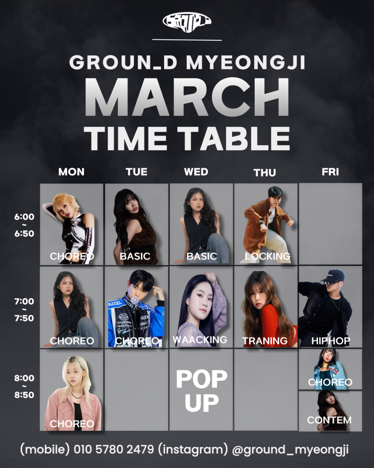 안녕하세요 그라운디댄스학원입니다!! 3월과 함께 새롭게 시작되는 전문반 시간표를 안내드립니다 ✨ 수강을 고민 중이시라면 참고해주세용 전문반 시간표 안내 ✔ 월요일 6:00~6:50 마멜T (코레오) 7:00~7:50 슬비T (코레오) 8:00~8:50 여름T (코레오) ✔ 화요일 6:00~6:50 아키T (베이직) 7:00~7:50 이원T (코레오) ✔ 수요일 6:00~6:50 슬비T (베이직) 7:00~7:50 진희T (왁킹) 8:00~8:50 팝업 클래스 ✔ 목요일 6:00~6:50 모찌T (락킹) 7:00~7:50 도토T (트레이닝) ✔ 금요일 7:00~7:50 대성T (힙합) 8:00~8:50 햅스T (코레오 / 매달 2째 주 진행) 아키T (컨템포러리) 전문반은 단순하게 안무만 배우는 수업이 아닌 장르별 수업과 트....... <img src="https://blogthumb.pstatic.net/MjAyNjAyMjdfMjAg/MDAxNzcyMTg3NzkwMTU2.CbnKJElY1TGNgZqUgtEH0MSxyy369rQ9Jn_YMPvxIs8g.JliEVzrvbwbeFFrMTvRIXJvuQlBt0dWRnKSeQqkjTQsg.PNG/001.png?type=s3" />