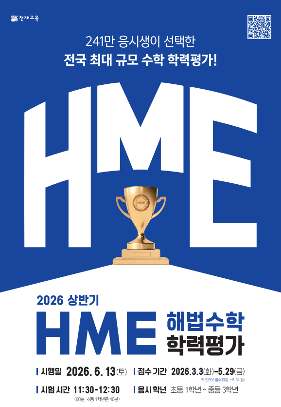 #명지해오름학원 #T클래스 #초등전과목 #한국사 #한자 #초등수학 #루미북클럽 #국어논술 #책읽기 2026년 상반기 HME 수학학력평가 접수시작~~ 일시: 2026년 6월 13일 토요일 시간: 11시 30분-12시 30분 HME 시험준비 끝~~ <img src="https://blogthumb.pstatic.net/MjAyNjAzMTZfMTI2/MDAxNzczNjM2MTkwMjg4.47szL64MvLVqCQuoMYQuwMG____Q69_3QIhUFmVNXWwg.bta72AE2Y0jenVCclNUB7cunrTOEuIigjQNqjql88dcg.PNG/image.png?type=s3" />