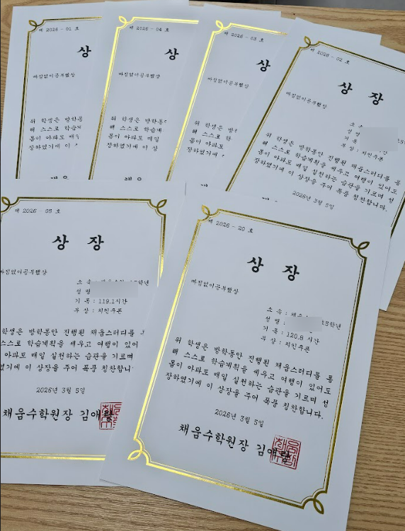 안녕하세요!! 생각하고 해결하고 성장하는 채움 수학의 열정품은 애랑쌤입니다. 길고도 긴~ 겨울 방학이 드디어 끝이 났습니다. 다들 목표한 계획들은 잘 달성하셨나요? 채움수학 학생들의 겨울 방학은 그 누구보다도 알찬 시간이었을 거라 생각합니다. 왜냐하면.... 이번 겨울 방학 '채움스터디' 가 성공적으로 마무리되었기 때문입니다. 혼자서는 실천하기 어려운 일도 함께 목표를 세우고 인증하면서 도전하면 더 잘 해낼 수 있습니다. 채움 스터디 챌린지 결과 & 시상 내용 '측정할 수 없으면 개선할 수 없다' 채움스터디 챌린지 시상 기준은 '매일매일 실천'입니다. ✔ 빠짐없이했상 기준 : 미 실천 2일....... <img src="https://blogthumb.pstatic.net/MjAyNjAzMTJfMjIx/MDAxNzczMzE1OTM2MjM3.sg_JPuD7NfyJSabEV-roAYSNplq_IyTkyKkybdzgBC8g.2_xpOaa4MLONIxFJR-UKfU17NdPhR3QxQXOvfASXUHog.PNG/image.png?type=s3" />