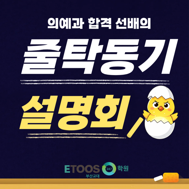 안녕하세요. 이투스247 부산교대점입니다. 26년 2월 24일 화요일 16시에 이투스247 부산교대점에서는 의예과 합격 선배와 함께한 줄탁동기 특강이 있었는데요 그 현장을 공개합니다❗❗ 자세한 내용은 아래에서 만나보시죠! '줄탁동기' 설명회 "병아리가 알에서 나오기 위해서는 새끼와 어미닭이 안팎에서 서로 쪼아야 한다" 이번 특강을 맡으신 박OO 합격선배는 인제대 의예과에 합격하였습니다. 중간에 힘들어서 포기할까 생각을 한적도 있다고 하는데, 어떻게 극복해서 의예과 합격을 이뤄냈는지 후배들에게 들려줄 이야기가 얼마나 많을지 생생한 현장 함께 보러갈까요?♀️♂️ 1️⃣ 공통적인 학습방법 2️....... <img src="https://blogthumb.pstatic.net/MjAyNjAyMjZfMjgg/MDAxNzcyMDk5NzE3MDI1.7BpET6BQNSeTMQ-o8dQXKOhjldj4dHt6cPF5E9gszN8g.W3JlsYzFKstAmbkF5QUcHBtIJliudE7-wlzvmYq7U8og.PNG/%C1%D9%C5%B9%B5%BF%B1%E2.png?type=s3" />