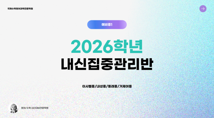 [예비중1 과정 준비가 필요한 이유] 중학교 시험을 제대로 준비하기 위해서는 초등학교와는 다르다는 것을 인지해야합니다. 단원별 이해도를 평가하는 초등학교와는 달리 중학교에서는 좀 더 깊이있는 학습 관리가 필요합니다. 특히, 학습 시간을 늘려가는 연습과 함께 자신에게 맞는 학습 스타일을 익히는 과정이 필요합니다. 문해력이 좋은 학생들은 시험 문제 난이도에 상관없이 고른 점수가 유지가 되지만 문해력이 부족한 학생들의 경우에는 시험 난이도에 따라 점수 편차가 크게 발생합니다. 국제수학영어과학전문학원은 학생들이 보다 쉽게 중학교 과정에 적응할 수 있게 단계별 학습 시스템을 활용하고 있습니다. 개념 정리와 유형별 문....... <img src="https://blogthumb.pstatic.net/MjAyNTEyMDRfMTEw/MDAxNzY0ODM2MzIwNjUz.LxggzszPRl0WBHAYTnLPtwows-V3JHzt1xCDEyOMi5Ug.MMaeQJdZdQLTGe59CcHy1cOWnnOTPADp6Zfn728NYjIg.PNG/%C1%A6%B8%F1%C0%BB_%C0%D4%B7%C2%C7%D8%C1%D6%BC%BC%BF%E4..png?type=s3" />