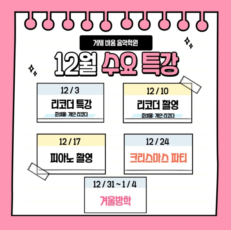 안녕하세요 거제 바움 음악학원입니다. 다가오는 12월은 행사가 많은 달인데요~ 크리스마스 느낌 물씬 나는 곡으로 연주 영상을 촬영할 예정입니다⛄ 연주 영상은 학부모님 카톡으로 당일 전송해 드리고 있습니다 ⛄ ⛄ 그리고 우리 아이들의 최대 관심사!!! 파티입니다 5월는 어린이 파티, 12월은 크리스마스 파티를 할 건데요~~ 12월은 뽑기도 한답니다 작년 크리스마스 파티 사진입니다 피아노 연습 후에 우리끼리 재미있는 게임도하고 맛있는 떡볶이도 먹고~~!! 우리 아이들은 제가 만든 떡볶이를 그렇게 좋아합니다ㅋㅋ 밖에서 파는 거보다 맛있다며... 1년 내내 얘기하는 아이들 이....... <img src="https://blogthumb.pstatic.net/MjAyNTExMjhfMjg0/MDAxNzY0MzAyMTY2ODk4.iXlzxi93A0CtORpleqYbGvE4e6XQbiBOtd-qJt4Hd_8g.tmX_DuSZnBJX9DsmXgfYqIs4lvoFX1Ru1x5mbLeK7iEg.JPEG/1764300973483.jpg?type=s3" />