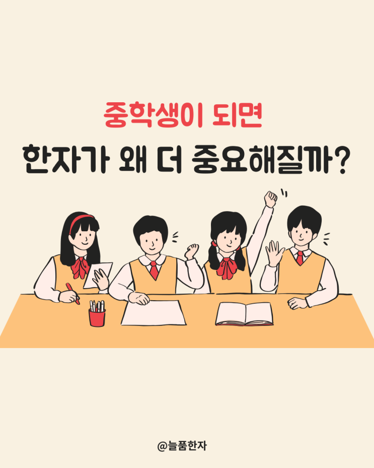 중학교 교과서에는 한자어로 된 추상적인 개념어가 급격히 늘어납니다. 늘품한자 애니메이션과 신 교재로 어휘력을 키워요! 2026년 1월부터 애니메이션 수업 시작했어요! 초등학교 때는 책을 많이 읽으면 어느 정도 버틸 수 있습니다. 하지만 중학생이 되는 순간, 아이들이 가장 많이 힘들어하는 과목은 의외로 국어입니다. 문제를 못 풀어서가 아니라, 지문이 이해되지 않아서 막히는 경우가 많습니다. 그 이유 중 하나가 바로 한자어 비중 증가입니다. ❶ 교과서 어휘 수준이 확 달라진다. 중학교 국어·사회·과학 교과서에는 추상적인 개념어가 급격히 늘어납니다. 예를 들어 ‘비판’, ‘갈등’, ‘관점’, ‘타당성’, ‘합리적’, ‘본질’....... <img src="https://blogthumb.pstatic.net/MjAyNjAzMDdfMjY2/MDAxNzcyODk0NTE5ODk1.40U5efDptJVKWGTBvt9h1UKC1QY3oVT2TYOQNtFZMKsg.JHMJnVgkDF7e9wtoAYlMwHQ_Konetlv52YdzGPAbROYg.PNG/20260308.png?type=s3" />