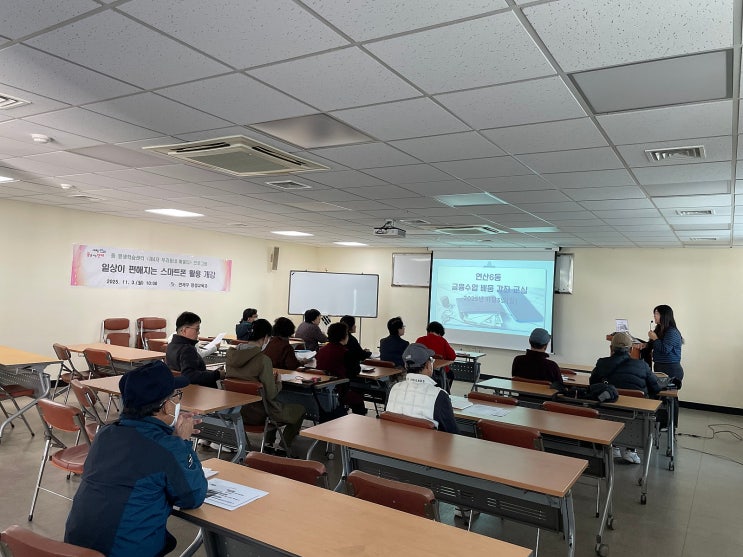 벌써 올해 우리동네 배움터4차 마지막 강좌입니다. 시간이 정말 빠르게 지나가는것 같아요 . 올해 연산6동과 연제구 평생교육과에서는 시니어 분들을 위한 스마트폰 활용교실에 많은 지원과 관심을 주셨는데요 그리하여 올해 연산6동 마지막 배움터 강좌도 시니어 분들을 위한 스마트폰활용교실 _금융편!!! 으로 강좌를 기획하고 진행하였습니다 (뿌듯해요~*0*//) 연제구 동평생학습 우리동네 배움터 4차시 개강 월요일 아침 이라 부담스러울수도 있었겠지만 우리 연산동 어르신들의 배움의 열정은 대단하신것 같아요. 수강생 대부분이 참석해 주셨어 순조롭게 개강식이 진행이 되었습니다. 이번 강좌의 수업목표는 어르신들의 스마트폰 기본 기....... <img src="https://blogthumb.pstatic.net/MjAyNTExMjFfMTQ0/MDAxNzYzNjg5MDExOTMy.Re2MV8Eny1HEMTgfB5kTe9s1QshT-hj5mGwWv5ucfM4g.acdzjyq-hkn_XFG828YP2EK7mfrlm7wAdwCB7_D3bIwg.JPEG/IMG_8898.jpeg?type=s3" />