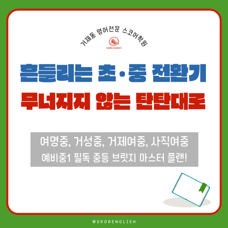 여명중, 거성중, 거제여중, 사직여중 예비 중1 학생들의 성공적인 중등 안착을 이어주는 든든한 다리, 거제동 영어 전문학원 스코어학원입니다. 본격적인 겨울방학을 한 달여 앞둔 12월 초, 이제 예비 중학생 학부모님들의 고민은 막연한 '걱정'에서 구체적인 '전략'으로 바뀌어야 할 때입니다. 초등학교 6학년에게 남은 시간은 곧 중학교 3년을 좌우할 결정적인 시기이기 때문입니다. 우리 아이가 중학교 시스템에 적응 못하고 뒤처질까 봐 불안해요. 사춘기가 오기 시작한 건지 엄마 말도 안 듣는데, 공부 습관은 어떻게 잡아야 할까요? 많은 학부모님이 초등학교와 중학교 사이에 놓인 "거대한 격차"를 인지하....... <img src="https://blogthumb.pstatic.net/MjAyNTEyMDNfMjAw/MDAxNzY0Njk2NDA5NTY0.AU9aHl5Q-YUAdNwn3MSrnHFxI8mXr77otWLzi1o1dkIg.z6vP_xNnEohp_YkdA9NkURyyP0X4MFYslmKOdhJzZvwg.PNG/1.png?type=s3" />