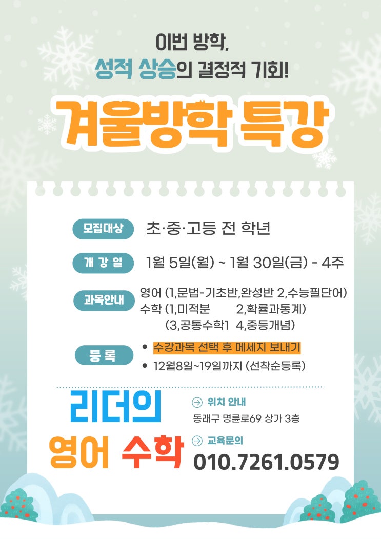 안녕하세요. 리더의 영어 수학입니다. 26학년도 대비 겨울방학 특강을 진행합니다. 언제나 특강은 조기 마감이 되오니 빨리 서둘러 주세요^^ 교육상담문의 010-7261-0579 <img src="https://blogthumb.pstatic.net/MjAyNTEyMDVfMTg4/MDAxNzY0OTI2NTc5Mzc5.NyzgVTr0Hg4URFKGGE3fNUCBmaXU6r-6SBpsqU9rqsQg.Id52VOx-I2M5ehLVWsPU-Pz6wzm1yHLmhVmdtAJ6Atkg.JPEG/%B0%DC%BF%EF%B9%E6%C7%D0%C6%AF%B0%AD.jpg?type=s3" />