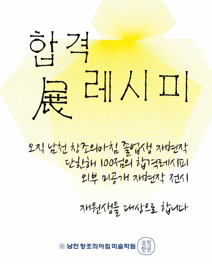 안녕하세요~ 남천창조의아침입니다. 올해 3월 입시반 정원마감으로 인해 입시설명회장의 좌석부족으로 저희 재원생 학부모님들만 모시고 입시설명회를 진행하게 되었습니다~ 홍보목적이 없는 우리학원의 입시전략과 방향을 정확히 알려드리고 지속적인 결과를 낼 수있도록 부모님들께 협조 또한 부탁드리는 너무나도 알찬 입시설명회였습니다~ 항상 최선을 다하는 남천창조의아침이 되겠습니다. 2026년 4월 남천창조의아침은 4월 11일 원외에서 입시설명회가 진행되었으며 원내에서는 합격재현작 전시가 진행되고 있습니다~ 남천창조의아침 만의 합격생재현작 외부로 공개되지 않은 2026학년도 #한양대학교응용미술교육과합격재현작 총 8점 2026학....... <img src="https://blogthumb.pstatic.net/MjAyNjA0MTZfMTE2/MDAxNzc2MzI3NjgzMTMy.1DSXbmoUp7t5vGVJPGnHIiscb5aJU5gqviB3uqd_OIsg.maW2QEAPZJZZqfZiR_Cx235UatOFAMy0zVHD2WzNFlEg.JPEG/%BA%CE%BB%EA%C0%D4%BD%C3%B9%CC%BC%FA%C7%D0%BF%F8%2C%B3%B2%C3%B5%C3%A2%C1%B6%C0%C7%BE%C6%C4%A7%2C2026%B9%CC%B4%EB%C0%D4%BD%C3%C7%D5%B0%DD%B0%E1%B0%FA%2C2026%C7%D1%BE%E7%B4%EB%C0%C0%B9%CC%C0%E7%C7%F6%C0%DB.jpg?type=s3" />