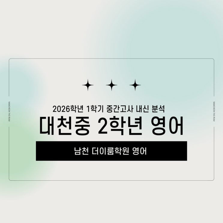 안녕하세요. 남천더이룸학원입니다! 이번 대천중 중간고사가 4월 21일부터 4월 23일까지 진행됐고, 영어시험은 4월 23일에 진행됐습니다! 중간고사를 위해 최선을 다해준 우리 대천중 학생들, 모두 정말 수고 많았어요! 시험 결과보다 더 중요한 것은, 그 결과를 어떻게 활용하느냐입니다. 그럼 이제 다음 시험을 위해 내신 분석을 진행해볼까요?! 2026년 대천중 2학년 1학기 중간고사 시험특징 이번 시험은 전체적으로 교과서 지문의 충실한 이해와 핵심 문법(5형식, to부정사, 간접의문문)의 활용을 묻는 스타일로 출제됐습니다. → 문자 메세지 줄임말의 활용 상황과 에티켓을 묻는 문항 → 5형식 구조에서 다양한 목적격 보어의 형태를 정확....... <img src="https://blogthumb.pstatic.net/MjAyNjA0MjdfMzYg/MDAxNzc3MjgxMjAzOTQy.OY2F5FsfahtbxX0Y405vhjrg1emhu_-zYYDZ63-hZRkg.AUyf_ZdI3XU3LWmMlwb4DvLVzvxsUJWfAfdigbreUw0g.PNG/%C1%A6%B8%F1%C0%BB-%C0%D4%B7%C2%C7%D8%C1%D6%BC%BC%BF%E4_-001_%286%29.png?type=s3" />