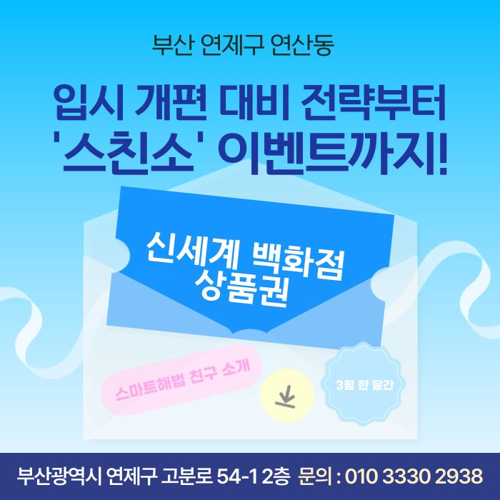 안녕하세요. 부산 연제구 연산동 연산자이 리드앤톡 스마트 해법수학 학원입니다. 새 학기의 설렘이 가득한 3월을 맞아, 연산자이 리드앤톡 스마트 해법수학 학원에서 우리 아이들이 친구들과 함께 즐겁게 공부할 수 있도록 아주 특별한 이벤트를 준비했답니다. 더불어 급변하는 입시 환경 속에서 우리가 무엇을 준비해야 할지도 함께 살펴보려 해요. 혜택은 키우고 지급은 빠르게! 스친소 이벤트 안내 연산자이 리드앤톡 스마트 해법수학 학원에서 3월 한 달간 '스친소 (스마트해법 친구 소개) 이벤트'를 진행합니다. 이번에는 특히 혜택이 더욱 강력해졌으니 꼭 확인해 보세요! ▶기간 2026년 3월 1일 ~ 3월 31일까지 ▶대상 기존 수....... <img src="https://blogthumb.pstatic.net/MjAyNjAzMTFfMjgy/MDAxNzczMjI2OTY4MTU0.LiFWFECcKPgDkXhij2DLIC673NwrnDUJAVG1Y7WYJPgg.9dPJy8inCBcryYk_SLAMp5QXmjFVwgkO1mXf0FR6-tYg.PNG/001.png?type=s3" />