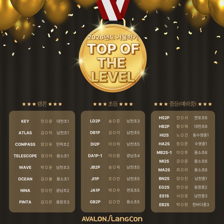2026 겨울학기에 선정된 TOP OF THE LEVEL 학생들입니다~ 너무너무 축하합니다! 이외에도 VOCA KING, BEST ESSAY, BEST AVOCADO&NOTE에 선정된 학생들도 너무 축하합니다! 매 순간 최선을 다하여 지난 3개월간의 겨울학기 대장정을 멋지게 마무리한 랭콘, 아발론 학생들 모두 정말 고생 많았습니다. 다시 한번 축하의 박수를 보냅니다-! <img src="https://blogthumb.pstatic.net/MjAyNjAzMDlfMjIg/MDAxNzczMDQyMDE1MjQ0.2eLTysBt3MPOA5Lt8bdGE7inANR0mrQb3HCfObgxOgcg.v7PxCG0eC0d1YJ2-aegV-vrhu7tJgCgytYBjlLVXIQkg.JPEG/%B0%DC%BF%EF%C7%D0%B1%E2%C5%BE%BF%C0%BA%EA%B4%F5%B7%B9%BA%A7-001.jpg?type=s3" />