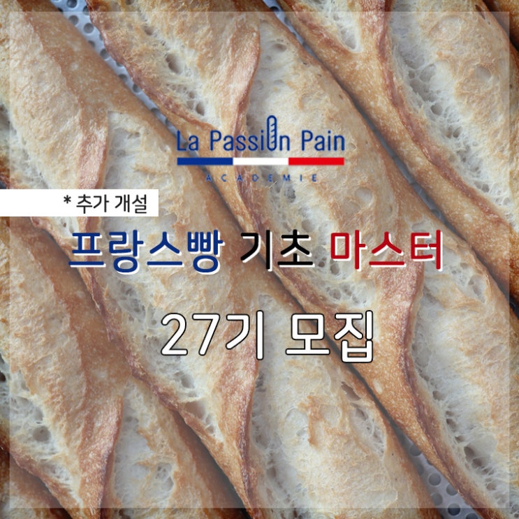 안녕하세요 라빠시옹빵 아카데미 입니다. 상반기 많은 관심과 사랑에 힘입어 5월 '목,금,토' 반을 추가 개설 합니다. 프랑스빵 기초 마스터 27기를 모집 합니다. 날짜, 운영시간을 정확히 확인 부탁드리며 커리큘럼 및 문의사항은 별도 링크를 통해 문의 및 확인 후 신중한 신청 부탁드립니다! 본 포스팅을 통해 이번 기수의 일정을 꼭 확인해주시고, 커리큘럼은 하단 링크를 통해 확인해주세요! ▼▼▼문의하기&커리큘럼 보기 (클릭)▼▼▼ 프랑스빵 기초 마스터 일정 안내 *필독 교육 기간 **신규 개설! 27기] 2026.05/14~7/04 (8주) 매주 목,금,토 10:00~16:00 (일일 5시간) *점심 휴게시간 12~13시 경, 약 1시간 (공정에 따라....... <img src="https://blogthumb.pstatic.net/MjAyNjAzMjJfNTMg/MDAxNzc0MTgxNTQxNDQ2.A3ziy2gGLo2qjbtbPfHdZU2KBlbKHP9JeZd4rgXrJZ8g.TEcyJBQyRhE0gjTLQnyC0ZwrIroT138ar2j5RtU7Yh8g.JPEG/%B1%E2%C3%CA_27.jpg?type=s3" />