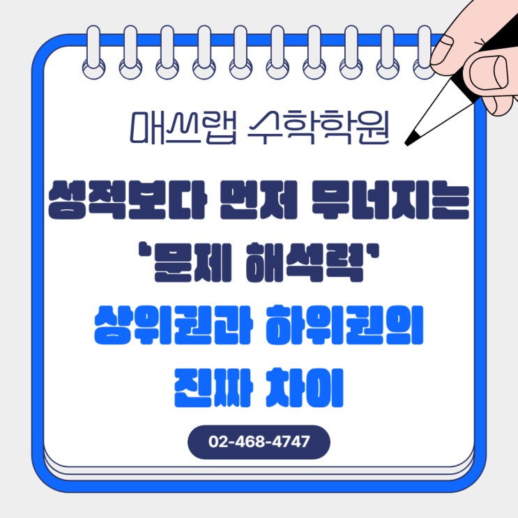 수학 성적보다 먼저 무너지는 ‘문제 해석력’ 상위권과 하위권의 진짜 차이 안녕하세요. 매쓰랩 제일학원 수학언어 연구소입니다. 학생들을 지도하면서 성적이 오르지 않는 이유를 분석하다 보면 공통적으로 발견되는 한 가지가 있습니다. 많은 분들이 수학 성적이 떨어지는 이유를 계산 실수나 문제 풀이량 부족으로 생각하시지만, 실제로는 그보다 훨씬 앞 단계에서 문제가 시작되는 경우가 많습니다. 바로 ‘문제 해석력’, 즉 문제를 읽고 이해하는 힘입니다. 현장에서 아이들을 가르치다 보면 이런 장면을 자주 보게 됩니다. 분명히 배운 개념이고, 풀이 방법도 알고 있는 문제인데 틀리는 경우입니다. 풀이 과정을 보면 계산이 틀린 것이....... <img src="https://blogthumb.pstatic.net/MjAyNjAzMjNfMTky/MDAxNzc0MjQxODM2Njc0.Vr2RQCtDPat7Lm978n1x9cWZHalaLiBJpeRHHV0Y9iMg.TbwyMmSBopq3sZwjXrhyVar55RmO3NJo0plkxbo6zZAg.JPEG/1.jpg?type=s3" />