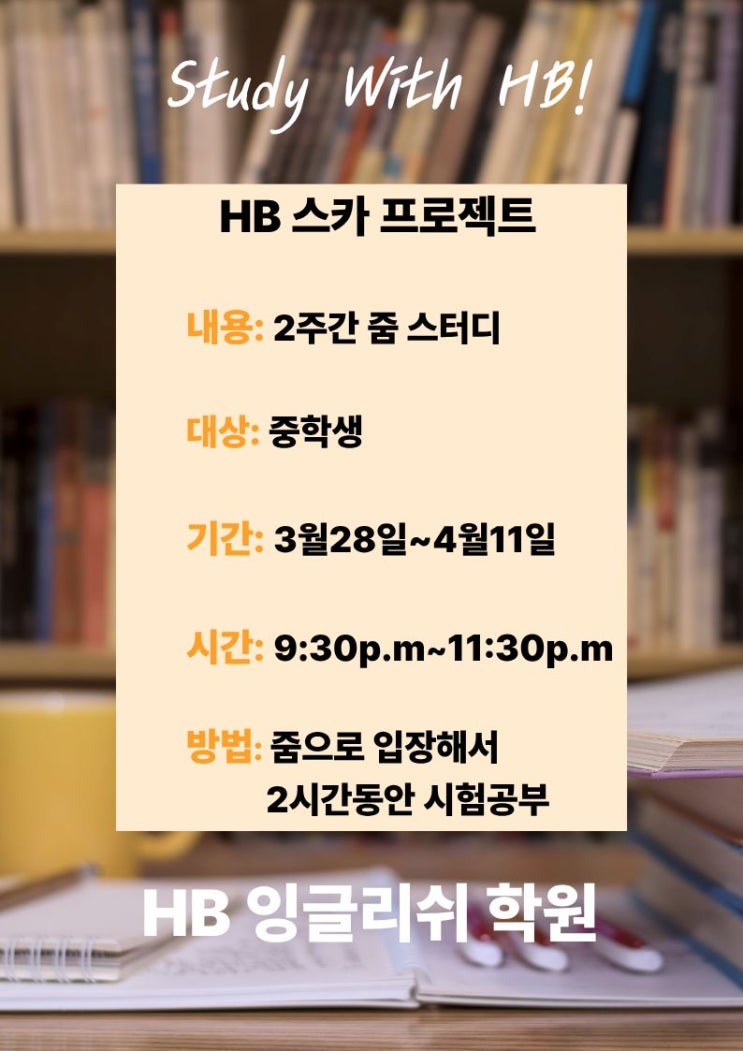 두둥~ 응봉동 광희중 무학중 중간고사대비를 앞두고, HB 스카 프로젝트 시작합니다. (줌 스터디카페 2주 집중 프로그램) 중간고사가 다가오면 아이들도, 부모님들도 같은 고민을 하시죠. “우리 아이, 이번엔 제대로 준비할 수 있을까?” 공부는 단기간에 결과가 만들어지는 것이 아니라 작은 습관이 쌓여 완성되는 과정입니다. 그래서 HB에서는 아이들이 ‘억지 공부’가 아니라 스스로 공부하는 힘을 기를 수 있는 환경을 만들고자 이번 프로젝트를 준비했습니다. HB 스카 프로젝트란? HB 스카 프로젝트는 온라인 Zoom 스터디카페 방식으로 진행됩니다. 같은 시간에 접속해 각자 공부를 하면서도 서로의 집중하는 모습을 보며 자연스....... <img src="https://blogthumb.pstatic.net/MjAyNjAzMjNfNDQg/MDAxNzc0MjI3Mzg3NDkx.LsOcH2QddTOeenPiBa55OHZNhEhU-OOlYxP1H1qV_a4g.kxY8Oea2PIcXBitG4sNFjM9-gT8I9FncT5oHqX1ofdsg.JPEG/HB%BD%BA%C4%AB.jpg?type=s3" />