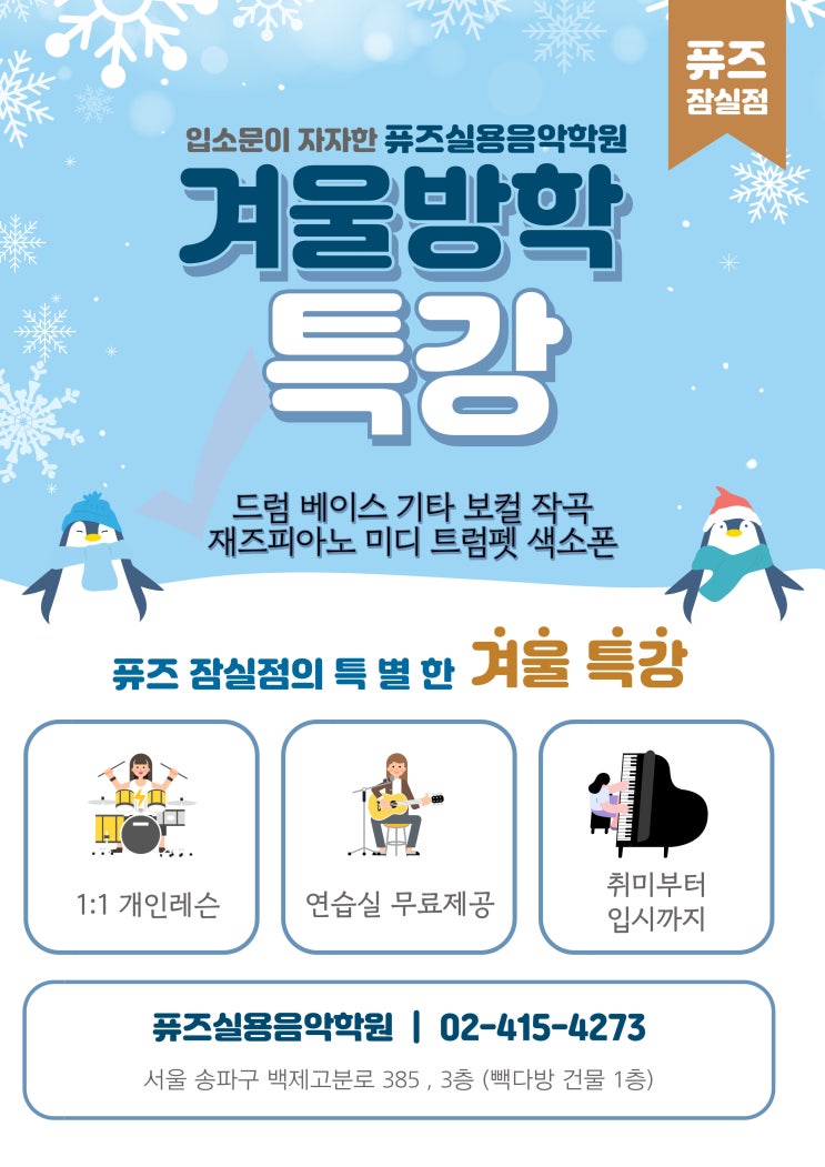 안녕하세요 ! 송파구 송파동에 위치한 퓨즈 잠실 실용음악학원입니다 ^^ 벌써 겨울이 되어 첫눈이 펑펑 내리네요. 한 해를 마무리 하고 또 다른 한 해를 맞이하는 중요한 시기이죠~! 겨울방학이라는 긴 시간동안 우리 아이들을 위해 여러 체험과 특강 등을 알아보고 계신 학부모님들도 많으실거라고 생각되어요. 그래서 준비한 퓨즈 잠실점의 겨울방학 특강! 겨울방학 특강 대상과목 드럼 베이스 기타 보컬 작곡 미디 피아노 (재즈피아노, ccm, 가요반주법 등) 트럼펫 색소폰 화성학 수업 방식 1:1 개인레슨 50분 수업 개별 맞춤 커리큘럼으로 원하는 곡 위주의 수업 및 원하시는 방향에 맞게 수업합니다^^ 연습실 사용 방학시간동안 낮시간의 공....... <img src="https://blogthumb.pstatic.net/MjAyNTEyMDVfMjY0/MDAxNzY0OTMxMDE2MjAz.lAZgMoMw3Su7Wr9rpVTh9mSgyvj_frmevSGePLwD-_Mg.1yoJFDe7DgMas10v8CmvMmrySN_jhkpUYmePhxVVFF8g.JPEG/%B9%E6%C7%D0%C6%AF%B0%AD.jpg?type=s3" />