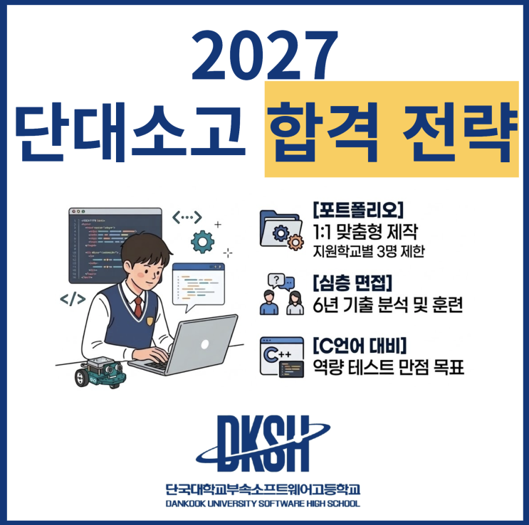 2027년, 단국대학교 부설 소프트웨어 고등학교(단대소고, 단대소프트고)입학을 꿈꾸는 학생이 있다면? 1기부터 2026년까지 6년 연속 다수의 합격자를 배출한 창의코딩랩이 정답입니다. 단대소고 입시는 매년 변화하는 전형과 높아지는 경쟁률로 인해 전략적인 접근이 필수입니다. [ 2020년 1기부터 2026년까지, 6년 연속 합격] 창의코딩랩은 단대소고가 설립된 1기(2020년 입학)부터 최근 2026년 전형까지 단 한 해도 빠짐없이 합격생을 배출했습니다. 2026년 전형에는 2명의 학생이 최종 합격하였습니다. 단대소고 1~3기 졸업생들이 학원에 지속적으로 방문해 멘토링을 진행하고 있습니다. 현재 재학생(1~3학년) 또한 실시간으로 학교 분위....... <img src="https://blogthumb.pstatic.net/MjAyNjAzMTBfMTUw/MDAxNzczMTIzNTYxNTYy.3dYmYLoP2B278c0kYlTWGNU4qQjhVkZu40QcP5wSslIg.q6sPM2MAHF31yGsg01dly53NQtkI0qjB5y00COa7NdUg.PNG/title2.png?type=s3" />
