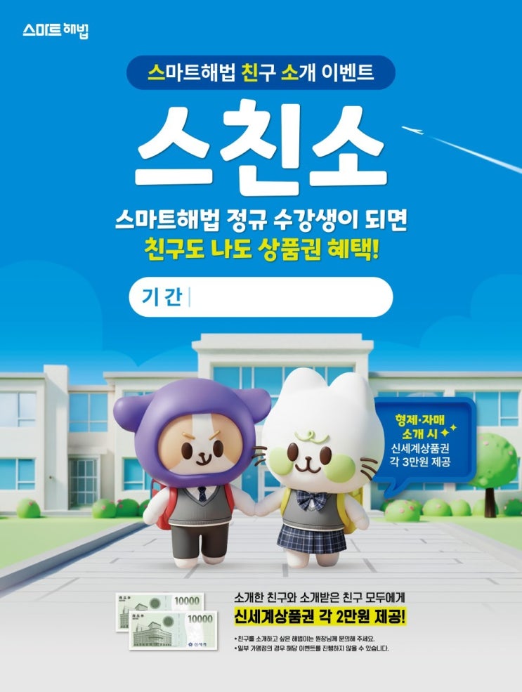 안녕하세요~~ 행당동 행당역 4번출구 한진타운상가 4층 1:1 맞춤학습, 개별진도학습, 소수정예수업 지니플러스 영수학원 원장 김혜진입니다. 매년 3월 신학기마다 진행되는 '스친소' 이벤트가 이번 3월에도 진행됩니다!! 3월 한달 간 친구 소개로 지니플러스학원에 등록 시, 소개한 친구와 소개받은 친구 모두 각각 '상품권 2만원'을 받으실 수 있는 이벤트입니다. 이번에는 특.별.히. 형제 자매 소개의 경우에는 각 3만원 총 6만원의 상품권이 제공된다고 하니 매우매우 좋은 혜택이네요~~^^ 학습을 고민중이신 학부모께서는 이번 기회를 통해, 상품권 혜택도 받으시고 우리 아이의 학습도 늦기전에 얼른 시작하시면 좋을 것....... <img src="https://blogthumb.pstatic.net/MjAyNjAzMTBfMjQ2/MDAxNzczMTM0MjQxNjIy.44Nn6wedVOFMt15InnbvuJuHip9LHHdxIHQMIXjlpEkg.tJnprRm-tYP2Xk7j8ood9Ax5aC9AobqY6gLYBKFngDgg.JPEG/KakaoTalk_20260310_175606632.jpg?type=s3" />