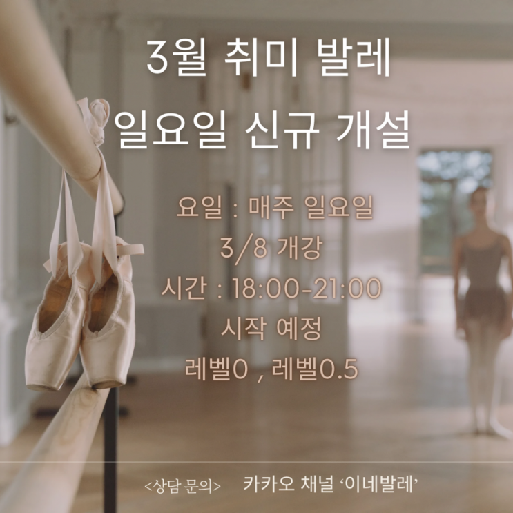 안녕하세요 ☺️ 텐즈힐몰 상가내에 위치한 #이네발레 학원입니다 3/8 일요일 개강으로 시간은 18:00-21:00 사이에 시작할 예정입니다! (개설 확정) 3월부터 수업 참여 원하시는 분들은 편하게 상담 문의주세요 2시간 무료 주차 가능 <상담 문의> 카카오 채널 '이네발레' #inneballet #이네발레 #이네발레학원 #이네발레스튜디오 #텐즈힐발레 #센트라스발레 #성동구발레학원 #성동구발레 #왕십리발레 #상왕십리발레 #발레스튜디오 #유아발레 #초등발레 #성인발레 #취미발레 #다이어트 #체형교정 #성동맘 #신당발레 #황학동발레 #자세교정 #발레 #신설동발레 #발레스트레칭 #토슈즈수업 #토클래스 #약수발레 #일요일발레....... <img src="https://blogthumb.pstatic.net/MjAyNjAyMjhfMjE3/MDAxNzcyMjc1MzUxMzIx.VnLwV6dR1D109Bn4Ji6isBoJWDnwGCQC-pooguy3N9og.jT5cIpAlLKKiKzril0tB8qWGe8gmopxff2ydGztoKl8g.PNG/%C0%CE%B5%F0%C7%CE%C5%A9_%B0%A8%BC%BA%C0%FB%C0%CE_%B9%DF%B7%B9_%C7%D0%BF%F8_%BC%F6%B0%AD%B1%C7_%C0%CC%BA%A5%C6%AE_%C0%CE%BD%BA%C5%B8%B1%D7%B7%A5_%C6%F7%BD%BA%C6%AE.png?type=s3" />