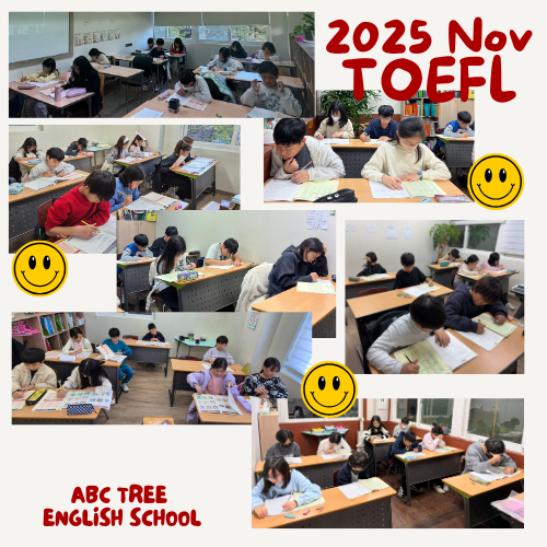 안녕하세요, 여러분! 지난 11월 10일 월요일에 2025 하반기 토플시험이 진행되었습니다^^ ABC TREE 본원은 일년에 두 번, 상반기 하반기에 토플시험을 정기적으로 보는데요~ 토플 기관 측에서 직접 방문해 시험을 진행하기에 우리 아이들이 익숙한 환경에서 시험을 볼 수 있어 더욱 집중하는 모습이었습니다^^ 평소 수업 시간에 꾸준히 연습해 온 리딩·리스닝·스피킹·라이팅 영역을 실제 시험 형태로 경험해 보면서, 우리 아이들은 자신의 실력을 점검하고 어떤 부분을 더 보완해야 할지 스스로 확인할 수 있는 시간이 됩니다. 시험이 끝난 후에, 아이들이 “생각보다 잘 본 것 같다”, “다음에는 더 높은 점수를 목표로 하고 싶다” 동기부여가....... <img src="https://blogthumb.pstatic.net/MjAyNTEyMDRfMTA2/MDAxNzY0ODI1ODM3OTUz.pB15JqnW32N_Vtru16MlKoZlYIwh6yKVwcSub02zofAg._H0nnbBr2EpyN0EJQLp25R5Lq-l0OJvy5ek32AEEuhMg.PNG/Red_and_Beige_Simple_Modern_Bold_Typographic_Fashion_Store_Logo_%281%29.png?type=s3" />