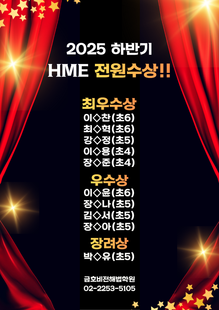 안녕하세요~^^ 스마트해법수학 금호동 비전해법학원입니다. 2학기가 어떻게 지나갔는지 모르겠네요 바쁜 게 좋은 건지,,^^,, 2학기 HME(전국해법수학 경시대회)를 준비해 보자 한 것 같은데 벌써 시험을 치르고 결과가 짜~~자잔!! 우리 비전 해법이들 정말 잘해주었습니다. 이번에 10명도 전에 5명이 최우수상입니다^^ 축하합니다~^^ 경시 도전을 즐겁게 여기며 수학이라는 과목에 성취감을 높여가는 멋진 친구들!! 늘 응원합니다☆☆☆ 상장과 메달이 도착하면 푸짐한 상품과 함께 배달해 볼게요~^^ <img src="https://blogthumb.pstatic.net/MjAyNTEyMDRfNjAg/MDAxNzY0ODU2NjI5ODY1.q4FVm5sEJ0IqrPvefoC7Uj0v6jFjyE5N9iPlEe_VEiAg.luaEdqgzw4JIYg1Wt3QotEnWC97XN_sr0BgY-mrojXgg.PNG/900%A3%DF1764828972055.png?type=s3" />