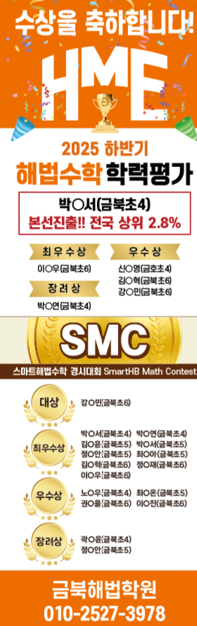 2025년 하반기 해법수학 학력평가 결과를 전해드립니다. 이번 평가에서 우리 학원 학생이 HME 본선 진출과 함께 전국 상위 2.8%라는 성과를 거두었고 그 외에도 해법수학 경시대회 에서도 대상, 최우수상·우수상·장려상 등 여러 학생들이 고르게 좋은 결과를 만들어 주었습니다. 이 결과는 단기간 문제 풀이식 수업이 아닌 개념 이해 → 적용 → 반복 확인이라는 체계적인 수업 흐름을 꾸준히 지켜온 결과입니다. 아이들마다 이해 속도와 학습 스타일이 다르기 때문에 학생별 학습 상태를 꼼꼼히 확인하고 부족한 부분은 바로 보완하며 수업을 진행합니다. 조금 느리더라도 정확히 이해하고 넘어가는 것을 가장 중요하게 생각합니다. 학력평가는....... <img src="https://blogthumb.pstatic.net/MjAyNjAxMTNfNzYg/MDAxNzY4MzAzODc4MzA0.Z_6eWtFgOvesyZHN3WhcToZe_d5K9ezDWsj1fxMw150g.1HPhmXJW10G9Eg1MG051M1GzPIb09_mbkJb316597UAg.PNG/1768303192837.png?type=s3" />