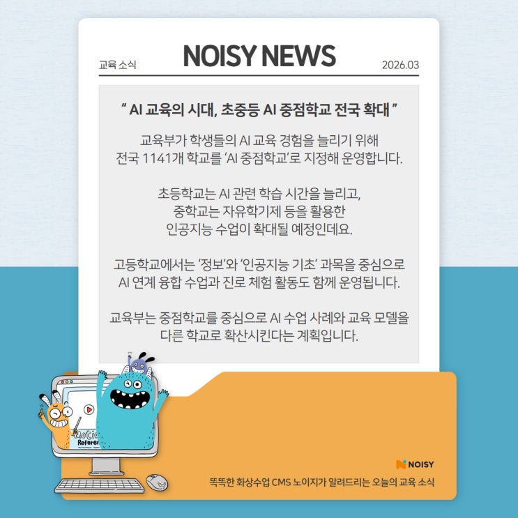 노이지가 알려주는 오늘의 교육 소식 ️ AI 교육의 시대, 초중등 AI 중점학교 전국 확대 [ AI 교육 확대… 전국 1141개 ‘AI 중점학교’ 운영 ] 교육부가 전국 1141개 학교를 ‘AI 중점학교’로 선정하며 초·중·고 인공지능 교육 확대 정책을 추진 중! AI 기술이 빠르게 발전하는 만큼 학생들이 학교 수업 속에서 인공지능을 이해하고 활용하는 경험을 자연스럽게 접할 수 있도록 하려는 취지 [ 학교 수업은 어떻게 달라질까 ] 초등학교: AI 관련 학습 시간 확대 중학교: 자유학기제를 활용한 체험형 수업을 운영 고등학교: ‘정보’와 ‘인공지능 기초’ 과목을 중심으로 AI 수업과 다양한 융합 활동....... <img src="https://blogthumb.pstatic.net/MjAyNjAzMTJfMjEw/MDAxNzczMjg3MjYzNjYz.hwbziJ87T6t3WNYuIPX5YyX88ECSfK6wxCHlOgip3-sg.6Sgk2pHr5AJDCn-WDTY902pIhu3hiwLOLyPDIpl57iUg.JPEG/%B1%B3%C0%B0%B4%BA%BD%BA_%C5%DB%C7%C3%B8%B4_.jpg?type=s3" />