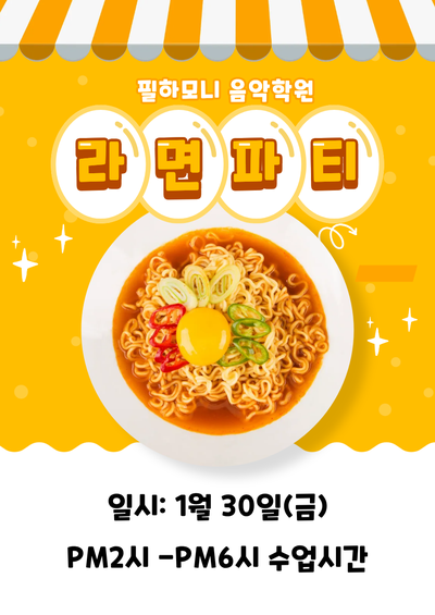 안녕하세요:) 우리 필친구들과 약속지키기! 연주회 끝나고 라면파티하자고 약속했던것을 학원방학과 다른 일정들로 인해 1월 마지막날에 진행했답니다^^ 우리 아이을 이날은 얼마나 기다렸나 몰라용! 우리 아이들이 좋아할만한 여러종류의 컵라면들 보이시나용~ 우리 아이들에게 제일 빨리 팔렸던 라면은 무엇이였을까요 ㅎㅎ 자기가 먹고싶은 라면을 사수하기위해 학원에 숨겨져있는 보물을 찾아라! 흰 종이 보물안에는 다름아닌 음악퀴즈가 적혀있답니다 음악퀴즈를 먼저 맞춘친구부터 먹고싶은 라면을 골라 맛있게 먹었답니다ㅎㅎ 때로는 아이들과 이렇게 게임을 하면서 배웠던것을 다시 한번 더 기억할수 있고 잊어버렸던것도 다시 배울수 있....... <img src="https://blogthumb.pstatic.net/MjAyNjAzMDJfMTM2/MDAxNzcyNDQ0ODExNDUz.3cCyCmXN2Bo1fWQDzffZBfTjb2F9jD0kY7QEWkeHcFAg.tVFAniaKo_WHCmWuDDOpq8fQ-bNWd3yJsqZmaLvk6aog.PNG/KakaoTalk_Photo_2026-02-20-21-20-01_001.png?type=s3" />