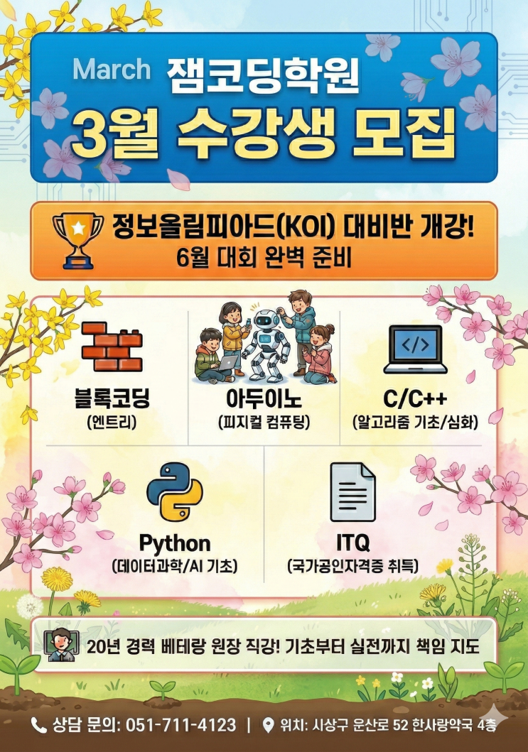 "우리아이 첫 코딩, 누구에게 배우는지가 가장 중요합니다." 안녕하세요! 부산 사상구에 위치한 프리미엄 코딩 교육의 중심, 잼코딩학원입니다. 설레는 새 학기가 시작되는 3월을 맞아, 체계적이고 깊이 있는 코딩 교육을 함께할 신규 수강생을 모집합니다. 왜 잼코딩학원이어야 할까요? 단순히 툴을 다루는 법만 가르치지 않습니다. 원리를 이해하고 스스로 사고하는 힘을 길러줍니다. 검증된 전문성: 20년 이상의 대학교 강의 경력을 갖춘 교수 출신 원장님 직강! 차별화된 노하우: 베스트셀러 C언어 교재 집필 저자의 탄탄하고 깊이 있는 커리큘럼 제공. 3월 신규 개강 및 특별 대비반 다가오는 6월 대회 완벽 준비를....... <img src="https://blogthumb.pstatic.net/MjAyNjAzMTJfMTQx/MDAxNzczMzA2ODczOTQ1.U7-NxMdpx8ZhoQAWpvO7oa0c0ZgEWv3w2CDJ_TwbWSEg.8AeDvQCpjlxtoanPScscvO9Pr2AxSd3WYH_CC7aEwV8g.PNG/26_3%BF%F9%BC%F6%B0%AD%BB%FD%B8%F0%C1%FD.png?type=s3" />