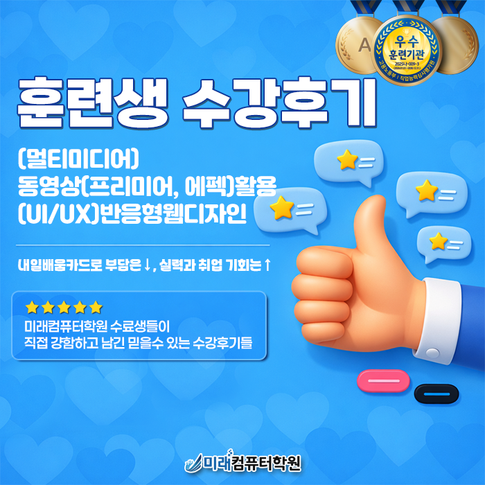 1. 내일배움카드로 시작한 훈련생 리얼 수강후기 (멀티미디어) 동영상(프리미어, 에펙)활용과 (UI/UX)반응형웹디자인을 함께 다루는 과정 수강후기를 모아봤어요. 내일배움카드로 부담은 ↓, 실력과 취업 기회는 ↑ 그리고 무엇보다 미래컴퓨터학원 수료생들이 남긴 믿을 수 있는 실제 수강후기를 한번 같이 확인해볼께요! 2. 만족도 5.0점, 비전공자도 “차근차근” 따라간 후기 점수부터 딱 보이죠. 훈련성과 5.0점, 훈련서비스 5.0점, 평균만족도 5.0점으로 디자인·코딩이 처음이었는데도 비전공자 눈높이에 맞춰 쉽게 차근차근 가르쳐줘서 많이 배울 수 있었다는 이야기가 나와요. 열정적으로 이끌어줘서 재밌고 유익한 시간이었다는 말로 마....... <img src="https://blogthumb.pstatic.net/MjAyNjAxMTRfMTA2/MDAxNzY4MzYxNTMzNzAw.5MVK4ai52pgBKtOHwKDTkyHy-yhwg4UX6e4QdU8Xt7Ag.eS5e2eJL7_J5v-240TN9Ni3o1OIm9BzL4VQiFI9HziEg.PNG/%BE%C6%C6%AE%BA%B8%B5%E5_1.png?type=s3" />
