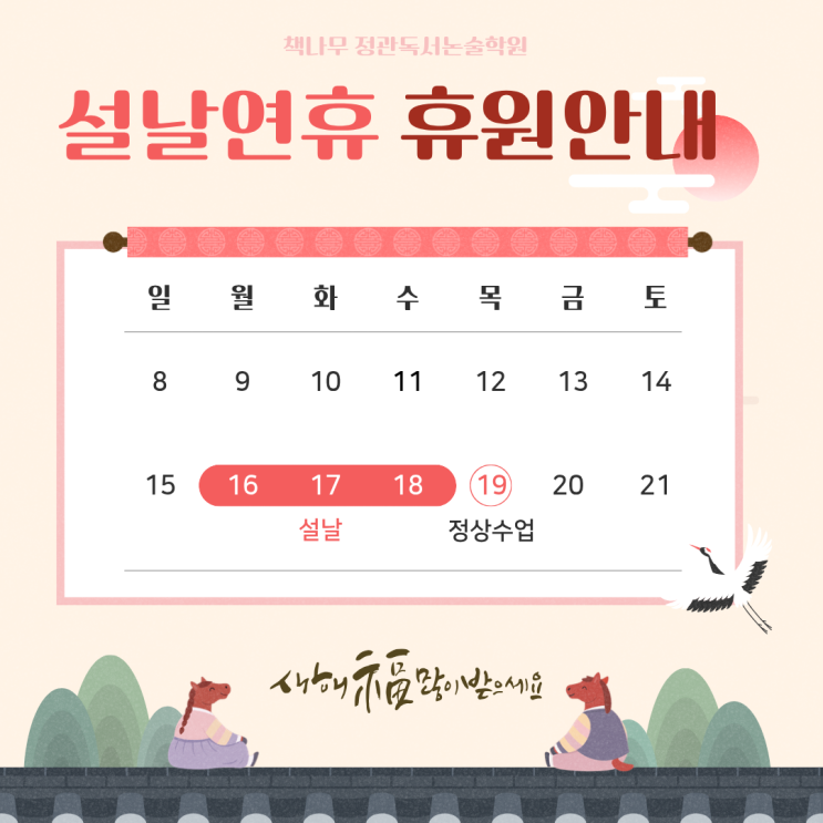 설날 연휴 안내 정관 루체테 어학원입니다 안녕하세요, 루체테 어학원입니다. 다가오는 설날을 맞아 학원 연휴 일정을 안내드립니다. 설날 연휴 기간 2월 16일 월요일 ~ 2월 18일 수요일 해당 기간 동안은 수업이 휴강입니다. 설날은 가족과 함께 따뜻한 시간을 보내는 소중한 명절입니다. 아이들도 잠시 학습의 긴장을 내려놓고 가족들과 웃고, 이야기하고, 행복한 시간을 보내길 바랍니다. 하지만 짧게라도 좋습니다. ✔ 하루 20분 영어책 읽기 ✔ 단어 10개 복습하기 ✔ 한 문장이라도 직접 써보기 이 작은 습관이 연휴 이후의 실력 차이를 만듭니다. 루체테는 더 탄탄한 수업으로 아이들의 성장을 이어가겠습니다. 새해 복 많....... <img src="https://blogthumb.pstatic.net/MjAyNjAyMTJfMTQ4/MDAxNzcwODgyNDMwNTk4.cIW6KxPsxlUeETDVXpuWVqn2X9FzQv4Qch6A2tHvM9kg.E5xehPdR6WkMQAqWNQ57cuFkKVcqrSDI0mSgtzIHj-sg.PNG/%C1%A6%B8%F1%C0%BB_%C0%D4%B7%C2%C7%D8%C1%D6%BC%BC%BF%E4._%2833%29.png?type=s3" />