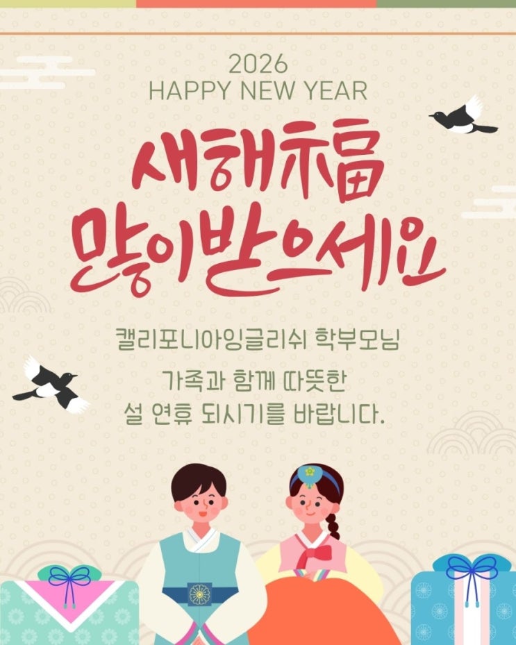 캘리포니아잉글리쉬 학부모님 가족과 함께 따뜻한 설 연휴 보내시기바랍니다 #정관캘리포니아잉글리쉬 #정관모전리영어도서관 등록번호 4408 21만원 23만원 27만원 <img src="https://blogthumb.pstatic.net/MjAyNjAyMTNfMjg5/MDAxNzcwOTQ4MDc2NDgz.x-i_AVazrR6cLH9xG9qfExI_esMghwBg12B2x91hA6Yg.0yS2hXRgFPWI1eW1NZ92IM-wky6t4SEIGatXC6XbJZAg.JPEG/900%A3%DF1770901032769.jpg?type=s3" />