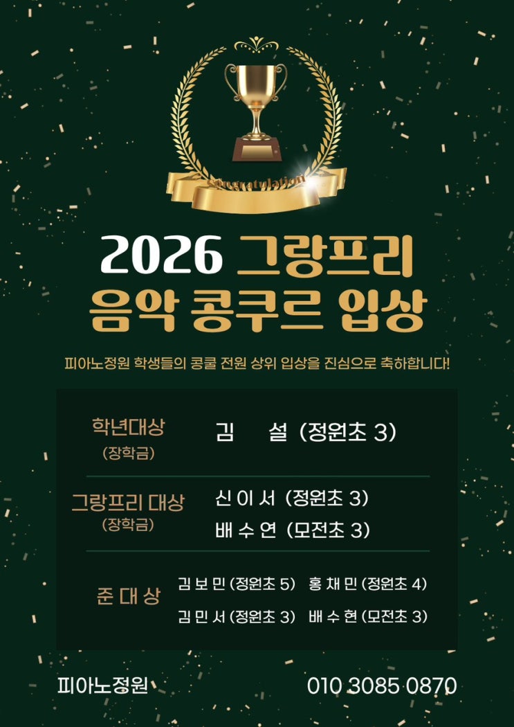 안녕하세요 피아노정원입니다 기쁜 소식입니다❤️ 토요일 콩쿨 참가했는데요! 우리 피아노정원 아이들이 전원 상위 입상했습니다~ 정말 3개월간 열심히 했는데요? 콩쿨 준비 기간 동안 수많은 리허설과 레슨, 연습 시간을 우리 아이들이 즐겁게 따라와 줬어요 힘들었을법한데도 게으름피우는 아이 한명 없이 정말 열심히 했어요! 우리 피아노정원 아이들 너무 멋있죠~ 준대상부터 어렵다는 학년대상까지 수상했고 정말 심사평이 너무 다 좋아서 너무 뿌듯합니다 전원 준대상 이상을 받기가 목표였는데 우리 아이들이 제 목표를 이뤄주었어요 정말 따뜻하신 우리 학부모님들 메시지까지❤️ (콩쿨 끝나고 우리끼리 콩쿨 파티도 했....... <img src="https://blogthumb.pstatic.net/MjAyNjAyMDhfMTMz/MDAxNzcwNTUwNDEwMjA4.UCc2ZSdR1UEWhJ4eiug1n2R3lbmHPZpSZ9FlJIBvFdwg.tpBPZBpBn8y5ff61O20PoF16-WWlZvCX0boG37QNKC4g.JPEG/IMG%A3%DF4867.JPG?type=s3" />