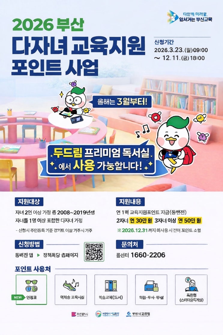 2026년부터 부산에서 다자녀 가정을 위한 교육지원 포인트 사업이 시작된다고 해요 자녀가 2명 이상인 가정이라면 연간 최대 50만원까지 지원받을 수 있는 좋은 기회입니다! 학원, 교재, 문구뿐만 아니라 이제는 독서실에서도 사용이 가능해졌다는 점✨ 두드림 프리미엄 독서실에서도 사용 가능합니다! 조용하고 집중 잘 되는 환경에서 아이들 공부 습관 잡아주기에도 딱 좋아요 신청은 동백전 앱 또는 홈페이지에서 가능하니 놓치지 말고 꼭 챙겨보세요! ✔ 신청기간 : 2026.3.23 ~ 12.11 ✔ 미사용 포인트는 연말 소멸 궁금하신 점은 언제든 문의 주세요 #부산정관독서실#부산정관스터디카페 #스터디카페#독서실#고3#고2#고1 <img src="https://blogthumb.pstatic.net/MjAyNjAzMzBfMTU0/MDAxNzc0ODQ0NjY1NDc5.KdKJZdvMQ5OnChCVsEMysc_Q4_zaavGbkX5JqlSuzlkg.eWECo7NQ849G_Gp2yu936vFUeCVRkzvIRNqXtUPI8wwg.JPEG/3746F825%A3%AD44EE%A3%AD4DFD%A3%ADA499%A3%AD7B4428A730BE.jpg?type=s3" />