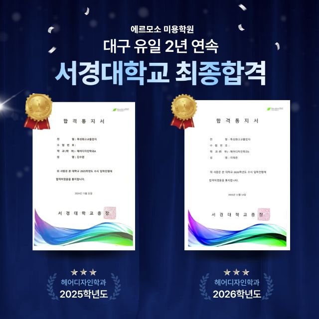 "대구 2년 연속 서경대헤어디자인과 최종합격"은 에르모소뿐입니다:대구미용입시학원[헤어디자인과와 계약학과는 다릅니다]