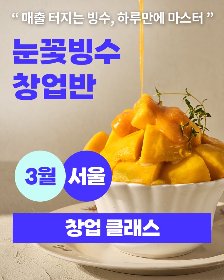 눈꽃 빙수 클래스 잘 팔리는 빙수는 따로 있습니다. 지금 배워야 시즌에 맞춰 바로 팔 수 있어요! 올여름 매장에서 바로 활용 가능한 베스트셀러 빙수 30종 레시피 증정! 과일 빙수와 눈꽃 빙수를 한 번에! 카페에서 딱 팔기 좋은 레시피만 골라 배워서 바로 판매 가능하게 가르쳐 드립니다. 서울 <빙수 창업반> 일시 : 3월 31일(목) 10:00 ~ 14:00 신청 및 문의 010-9457-9381 <수강 혜택> 여름 장사는 빙수가 다 한다고들 하죠. 하지만 막상 시즌이 다가오면 카페 사장님들의 고민은 깊어집니다. 관리가 까다로운 생과일 재고, 알바생이 만들어도 일관되게 유지되어야 하는 맛, 그리고 무엇보다 '우리 가게만....... <img src="https://blogthumb.pstatic.net/MjAyNjAzMTdfMjE4/MDAxNzczNzQ2MDU1MTk3.attFnEK6YRLgaMDNJwDTfoyVrMg7bjl9x2h659RlsSMg.NhaZBkbjkT8A7S-qxXBGdBxk1N6NVxWjaSESWQVO5tMg.JPEG/20260317_%BA%F9%BC%F6%C3%A2%BE%F7%B9%DD_%281%29.jpg?type=s3" />